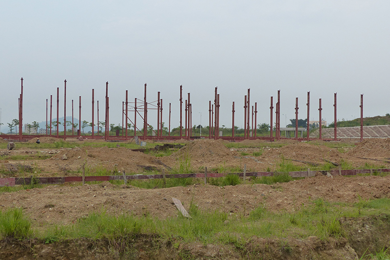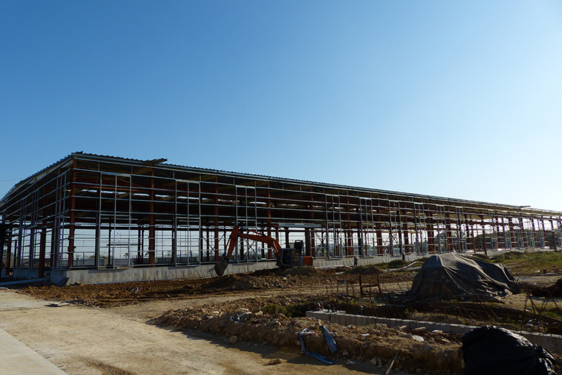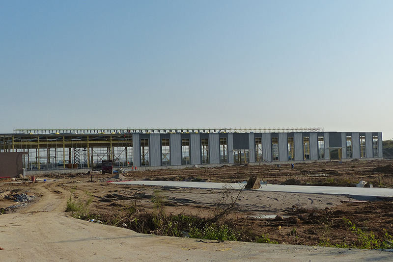 2016年12月9日,鋼結(jié)構(gòu)框架整體搭建完畢,進(jìn)入外墻及屋頂搭建,堆場(chǎng)也鋪設(shè)完成。